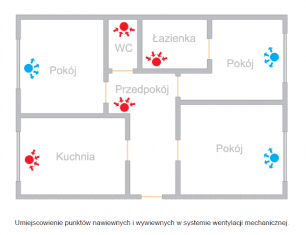 Na rysunku na czerwono oznaczono punkty wywiewne (anemostaty wywiewne), a na niebiesko nawiewne.