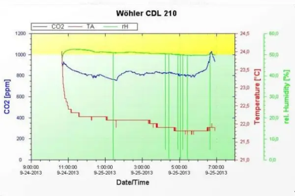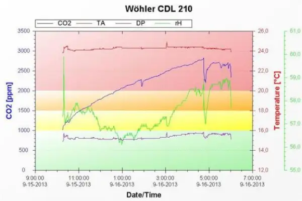 W domach z wentylacją grawitacyjną, przy zamkniętych oknach, po kilku godzinach snu, jakość powietrza zdecydowanie się pogarsza. W pomieszczeniu sypialni stężenie dwutlenku węgla już około 3 w nocy przekracza wartość 2500 ppm!* Obrazuje to wykres 1.