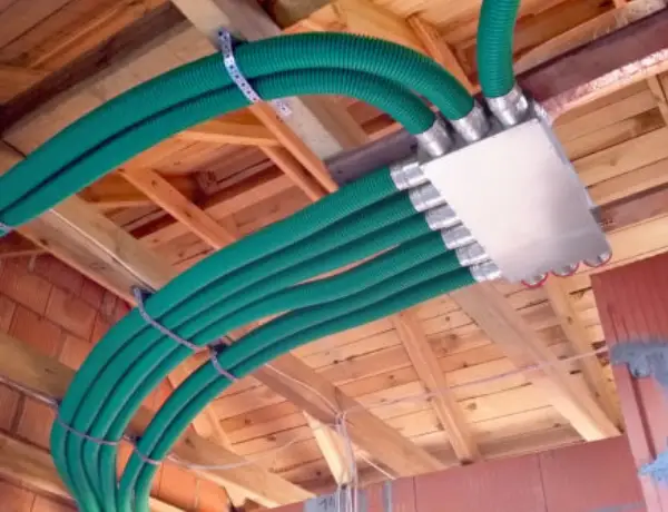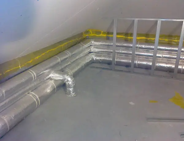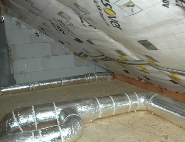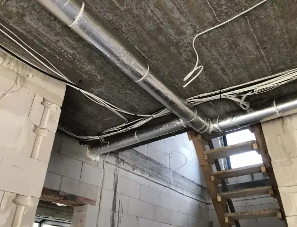 Kanały wentylacyjne schodzące z poddasza nieużytkowego, przez pomieszczenia na I kondygnacji do pomieszczeń na parterze zabudowuje się najczęściej płytą gipsowo-kartonową. Tu znowu ważne jest doświadczenie projektanta systemu rekuperacji, który będzie potrafił tak je dobrać i poprowadzić, że będą miały na tyle niewielkie średnice oraz będą schodzić w takich miejscach, że będą praktycznie niezauważalne – patrz zdjęcie poniżej.