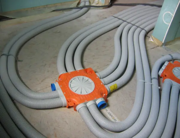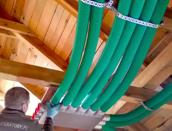 Instalacja wykonana z wysokiej jakości przetworzonego polietylenu o średnicy 64 mm pozwala na zalanie instalacji rekuperacji w posadzce
