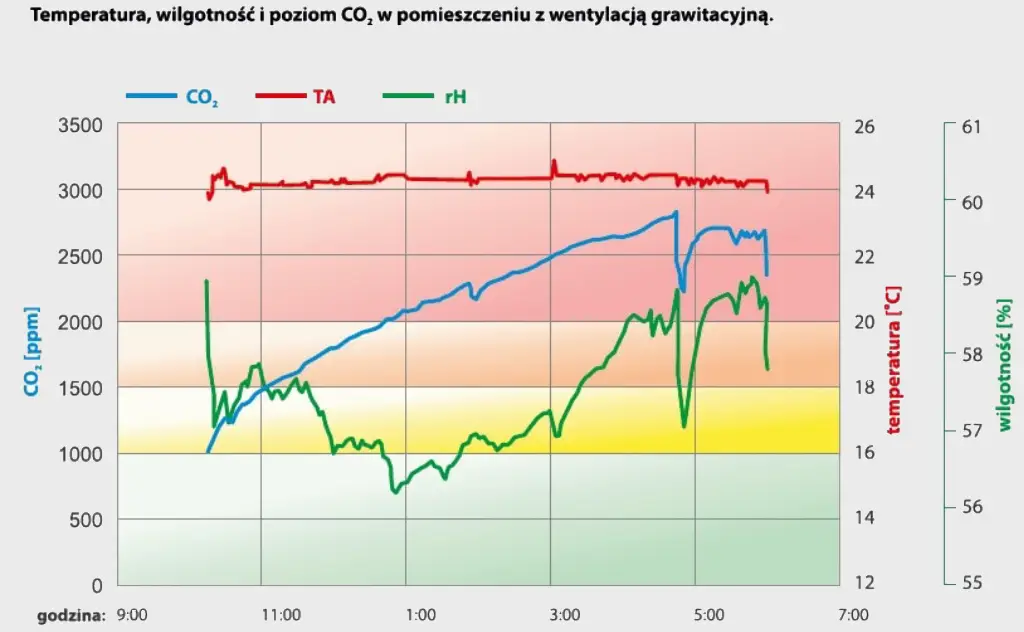 Na wykresie obok pomiary, które wykonaliśmy w pomieszczeniu sypialni mającej 12m² wyposażoną w wentylację grawitacyjną, w której przebywały dwie osoby dorosłe.