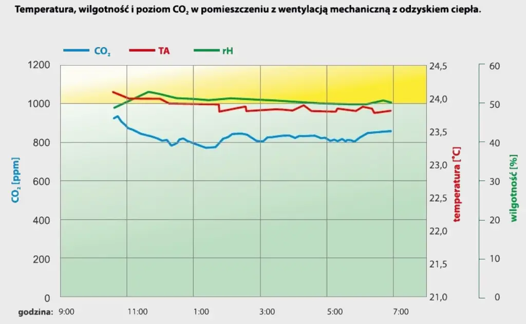 Proszę zwrócić uwagę na niebieską linię, która od około godz. 22.00 do rana cały czas rośnie: to stężenie dwutlenku węgla w pomieszczeniu.