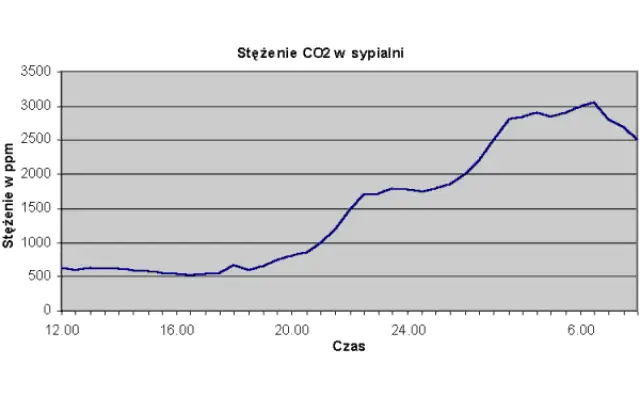 W sypialni przy zamkniętych oknach i braku wentylacji około godziny 1 w nocy stężenie dwutlenku węgla zaczyna przekraczać wartość normatywną.