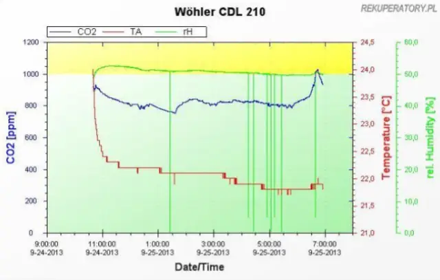 W sypialni w domu z rekuperacją poziom dwutlenku węgla nie przekracza 1000 jednostek przez całą noc.