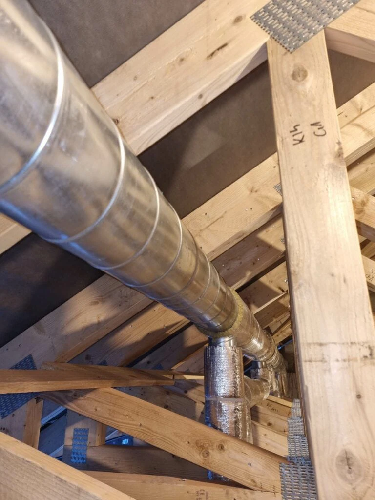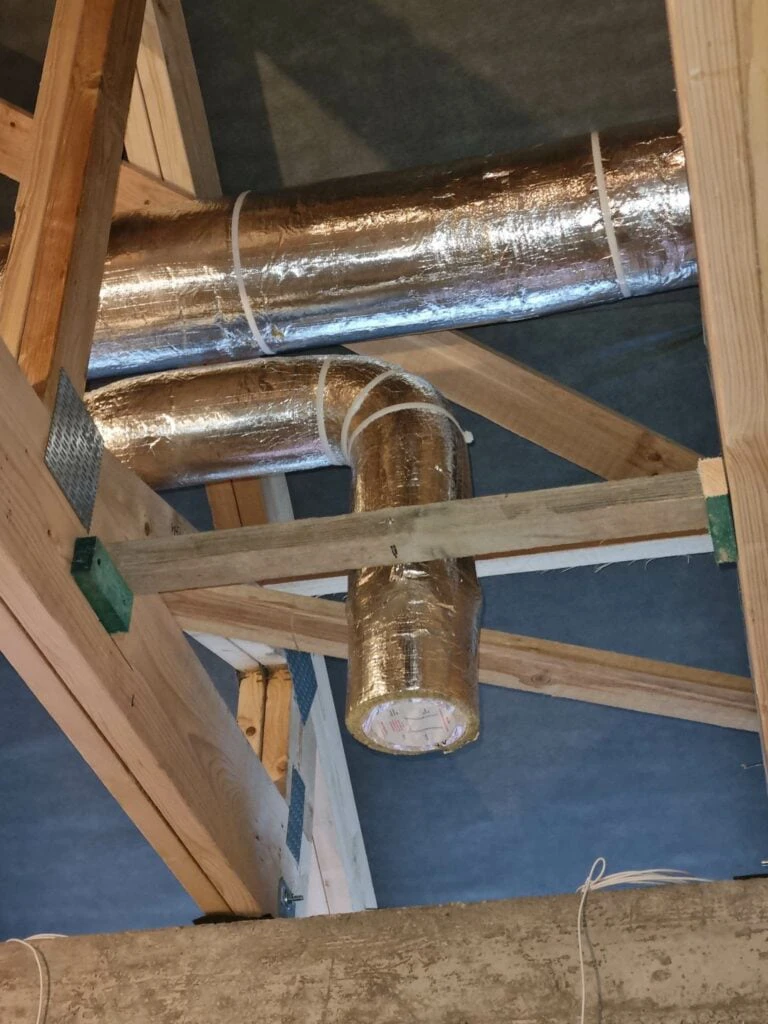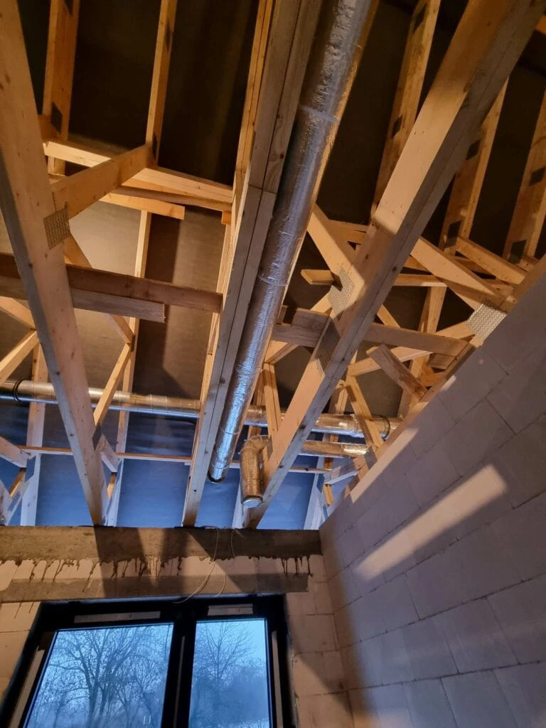 Instalacja z okrągłych kanałów Spiro przebiega w całości na poddaszu nieużytkowym. By nie zajmować miejsca, układamy ją w skosach dachu, a docelowo w ściance kolankowej.