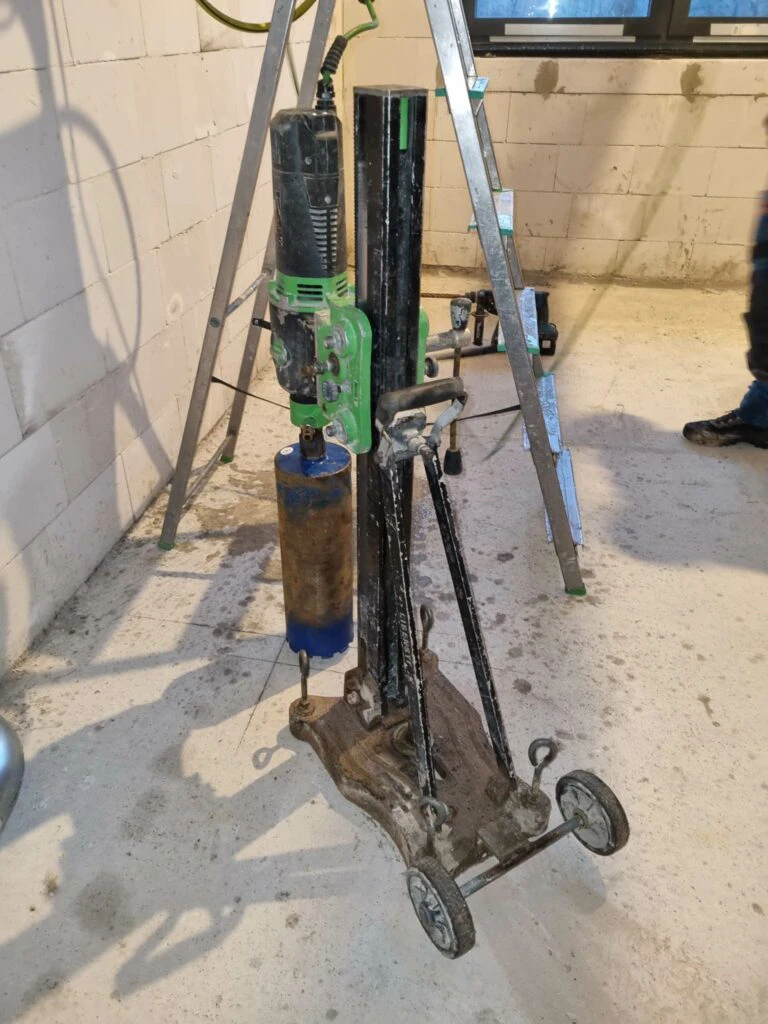Wiertnica wykonała otwory w wyznaczonych miejscach w stropie na poprowadzenie instalacji na parter.