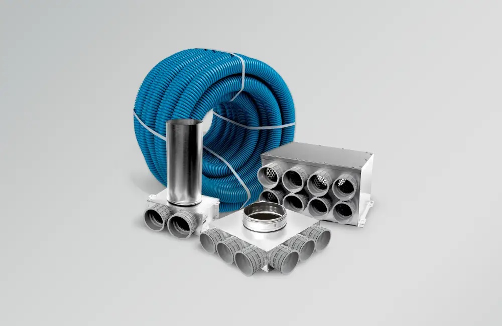 System NeoFlexST™: przewody z tworzywa PE oraz stalowe kształtki wentylacyjne.