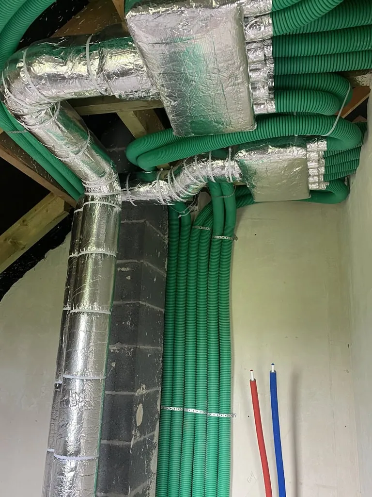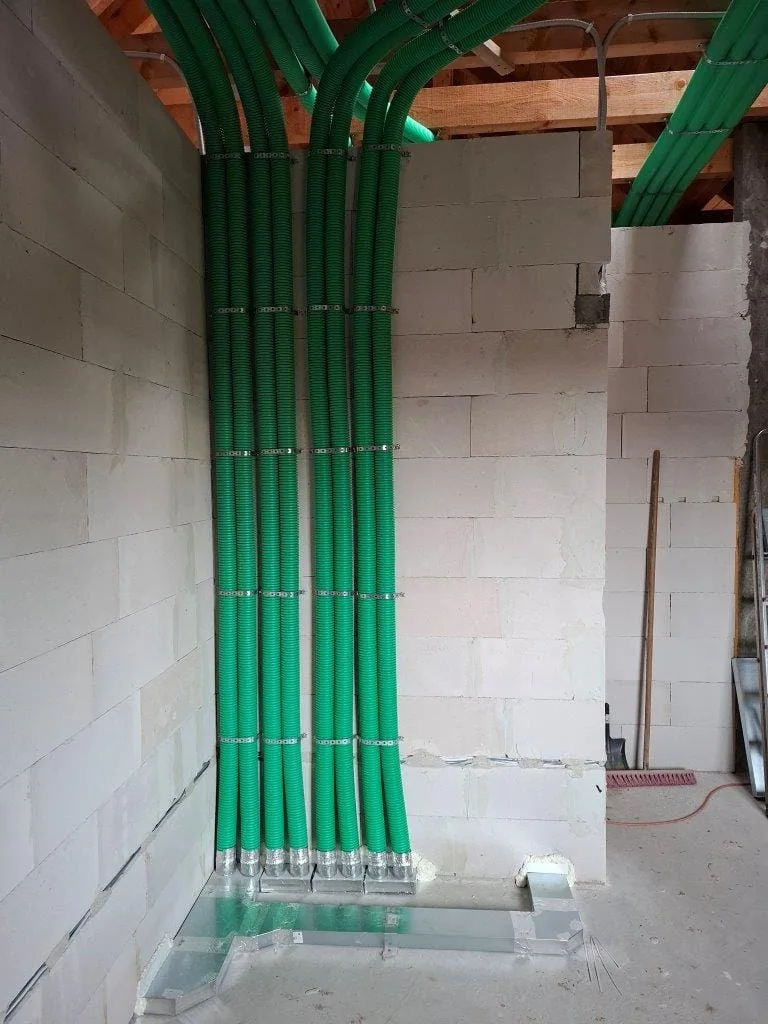 W instalacjach używamy przede wszystkim systemów z tworzywa PE NeoFlexST™. W budynkach o bardziej skomplikowanej architekturze montujemy płaski system NeoStal. Nasze instalacje są najczęściej hybrydowe: połączona klasyczna stal izolowana z tworzywem PE oraz z płaskimi kanałami ze stali.