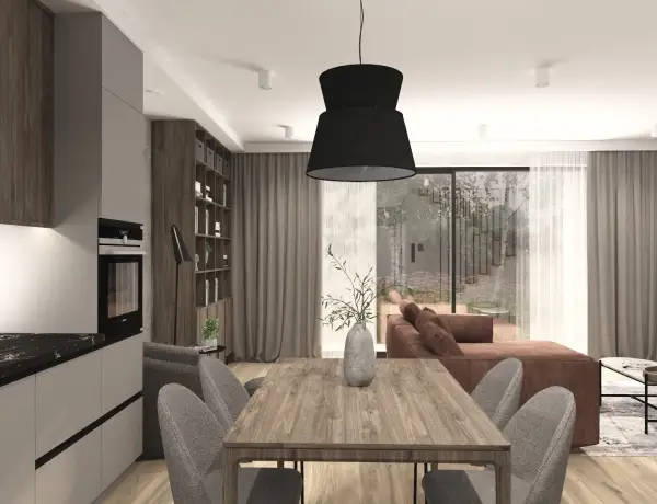 Nowoczesne domy często mają otwartą przestrzeń, łączącą kuchnię, jadalnię i salon, a także wyposażone są w zaawansowane urządzenia kuchenne i inteligentne urządzenia, które można zdalnie sterować.