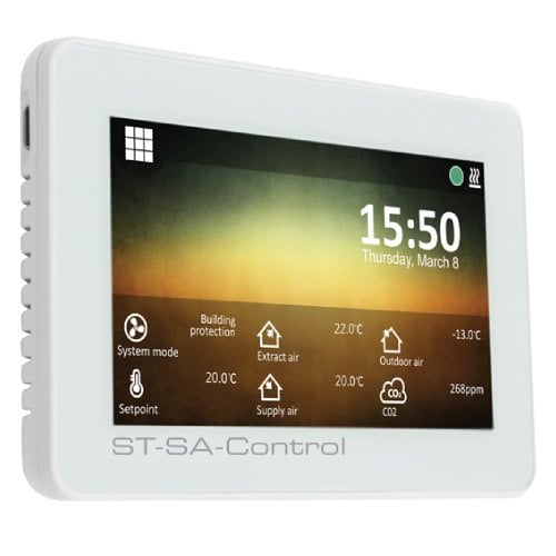 Sterownik SA-Control to panel sterowania z ekranem dotykowym, który zapewnia intuicyjną obsługę central wentylacyjnych RIRS oraz RIS. Wyposażony w czytelny ekran i wielojęzyczne menu, umożliwia łatwe monitorowanie i regulację parametrów pracy – takich jak temperatura, wilgotność czy poziom CO₂. Dzięki wbudowanym funkcjom harmonogramu, trybowi oszczędzania energii oraz wsparciu protokołu Modbus, sterownik łączy prostotę użytkowania z zaawansowanymi możliwościami konfiguracji.