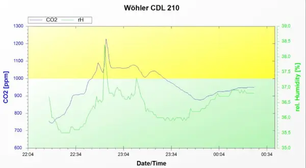 W domu z rekuperacją poziom dwutlenku węgla wystartował z poziomu 800 i urósł do 1250 ppm w czasie treningu, by przez kolejną godzinę powrócić do poziomu 800 ppm.
