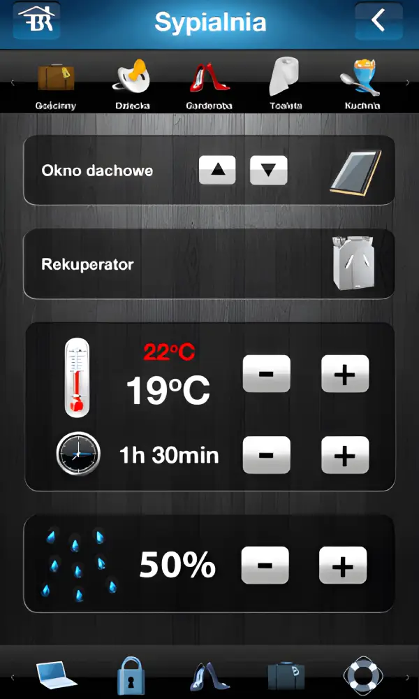 Gdy mieszkańcy są np. poza domem, aktywowanie sceny NIEOBECNOŚĆ, automatycznie ustawi wydajność wentylatorów rekuperatora na niskim poziomie 15%.