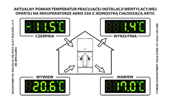 Pomiary systemu rekuperacji zimą: rekuperator ogrzał powietrze od minus 11,5 stopni do 17 stopni. Odzysk ciepła z wentylacji jest więc znaczący.
