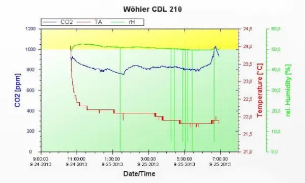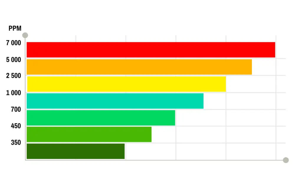 Stężenie dwutlenku węgla w pomieszczeniach nie powinno przekraczać 1000 ppm. 2500 ppm to wartość niebezpieczna dla zdrowia człowieka powodująca bardzo złe samopoczucie: ból głowy, mdłości, zaburzenia koncentracji i równowagi.