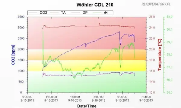 Dom bez rekuperacji: poziom dwutlenku węgla przez całą noc stopniowo rośnie aż do niebezpiecznej dla zdrowia wartości ponad 2500 ppm (!)